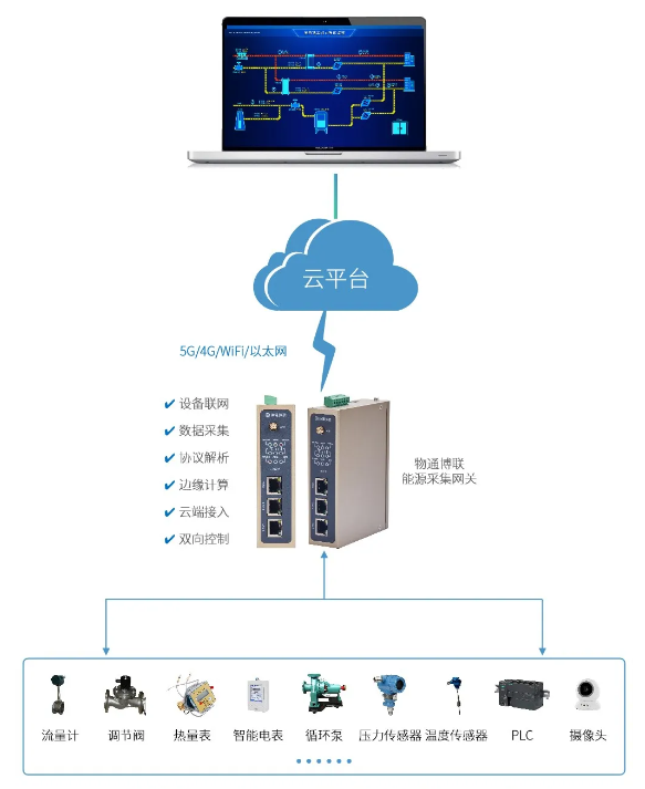 通過部署能源數(shù)采網(wǎng)關(guān),能夠?qū)崟r(shí)采集流量計(jì)、智能電表、熱量表、稱重儀器、循環(huán)泵、調(diào)節(jié)閥、溫度傳感器、壓力傳感器等設(shè)備,將供熱量、耗汽量、耗水量、耗電量、燃料消耗量、余熱利用量、溫度、壓力等數(shù)據(jù)對(duì)接到智慧供熱能源管理平臺(tái)中,從而將熱源、管網(wǎng)、中繼泵站、熱力站等納入統(tǒng)一的節(jié)能評(píng)價(jià)系統(tǒng)中,實(shí)現(xiàn)對(duì)能源的監(jiān)測(cè)、管理、統(tǒng)計(jì)與分析,助力提高能源利用效率與管理水平,實(shí)現(xiàn)節(jié)能、降本與增效的全面發(fā)展。